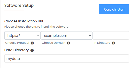 • Choose Installation URL: Choose the appropriate protocol/domain. Inside the "In Directory" field, should you want to install this in a directory, i.e., example.com/directory, enter the directory name. Otherwise, please, leave it blank to install in your main domain, i.e., example.com.