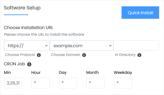 • Choose Installation URL: Choose the appropriate protocol/domain. Inside the "In Directory" field, should you want to install this in a directory, i.e., example.com/directory, enter the directory name. Otherwise, please, leave it blank to install in your main domain, i.e., example.com.